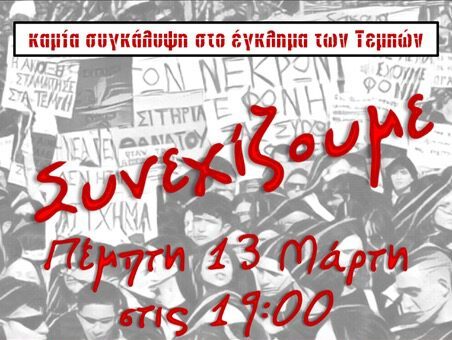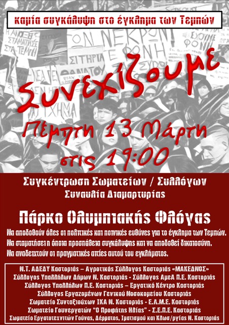 ο Σύλλογος Εκπαιδευτικών Πρωτοβάθμιας Εκπαίδευσης Ν. Καστοριάς ενώνει τη φωνή του με όλες τις φωνές του ελληνικού λαού που απαιτούν απόδοση πολιτικών και ποινικών ευθυνών και δικαιοσύνη, που απαιτούν να μπει τέλος στη συγκάλυψη, που απαιτούν κράτος δικαίου, που απαιτούν ασφάλεια στις μεταφορές και σε όλες τις υπηρεσίες και καλεί όλα τα μέλη του σε συγκέντρωση διαμαρτυρίας για το έγκλημα στα Τέμπη την Πέμπτη 13 Μαρτίου 2025 και ώρα 19:00 στο Πάρκο Ολυμπιακής φλόγας.